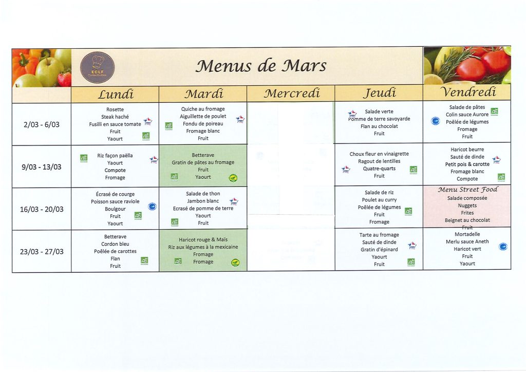 Les menus de la cantine , confectionnés par ECLF Collectivités :